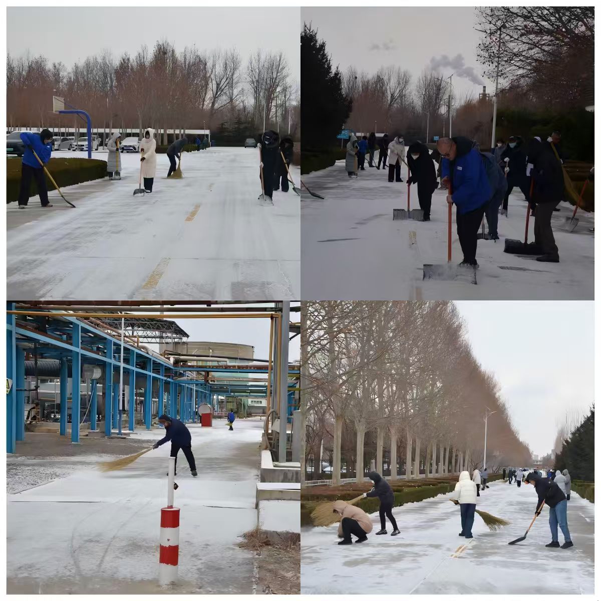 2026年首场降雪席卷山东大地,同大股份厂区内银装素裹。为保障生产安全与员工出行顺畅,公司第一时间启动应急预案,以“雪停即扫、即扫即清”为原则,组织各部门及车间员工迅速投入积雪清扫工作。在公司领导的带领下,中层管理人员、车间一线员工与后勤部门员工组成扫雪作业组,重点对厂区主干道、生产车间入口、员工停车场等区域进行集中清理,仅用两小时便完成全部清扫任务,有力保障了生产经营的有序运转。